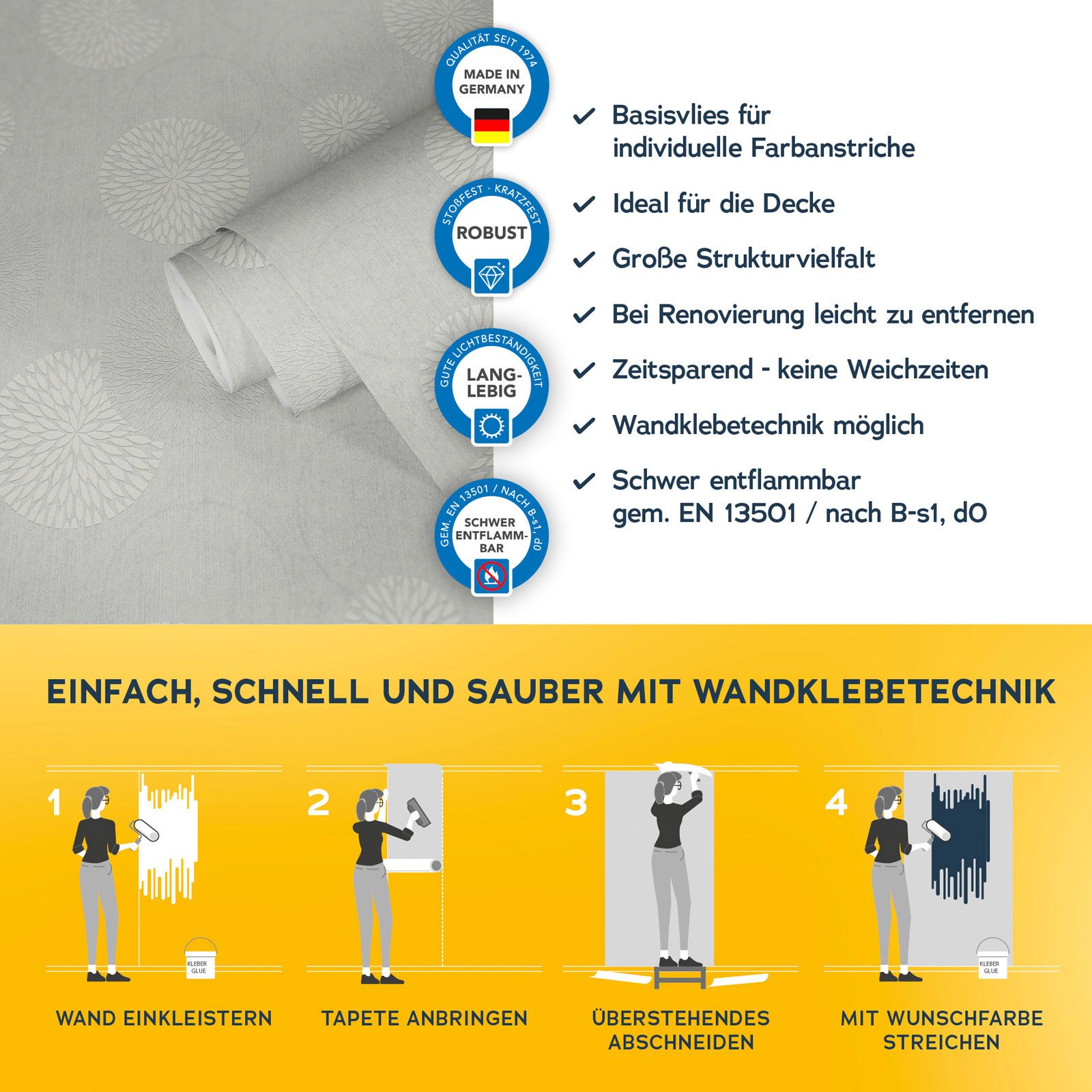 Mit der Meistervlies 8 Kollektion setzen Sie auf Qualität und Langlebigkeit. Die hochwertigen Vliestapeten sind besonders robust und langlebig. Dank der einfachen Verarbeitung und der Möglichkeit, die Tapeten mehrfach zu überstreichen, sind sie äußerst flexibel einsetzbar. Ob im Wohnbereich, im Büro oder in den eigenen vier Wänden Meistervlies 8 bietet die perfekte Lösung für jeden Raum.
