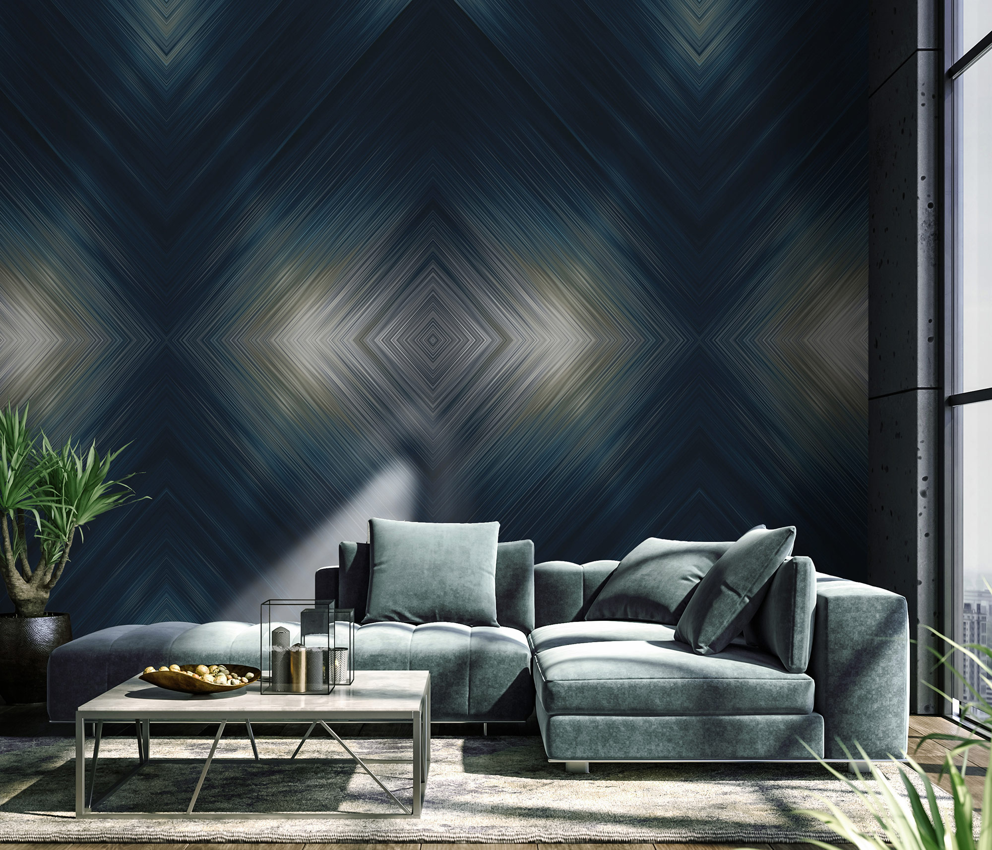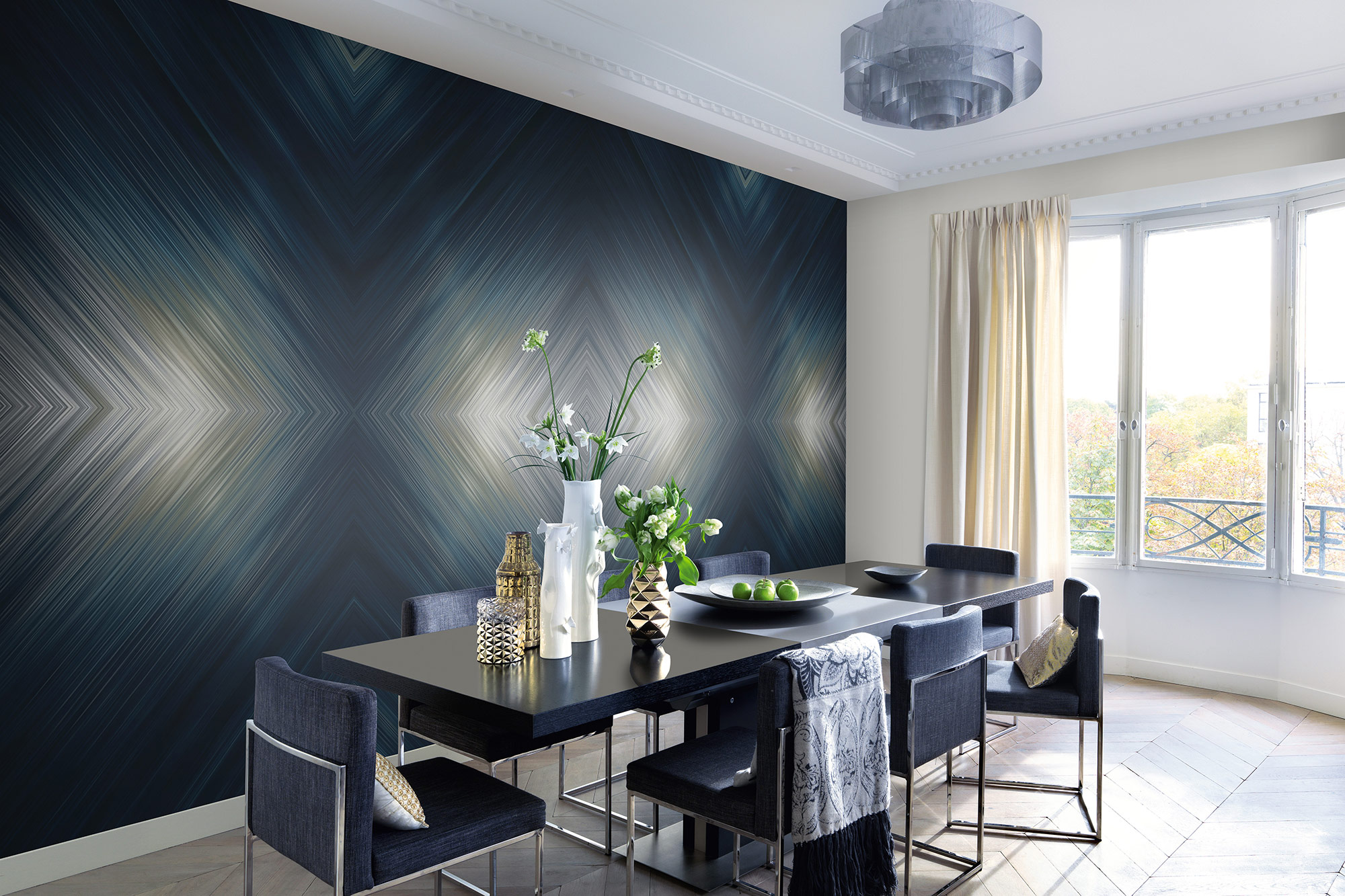 Nuancierte Silberlinien in feinsten Abstufungen in Kombination mit einem mitternachtsblauen Background sorgen bei der Fotowand LIGHTNING für einen besonders spektakulären Look. Fast wie ein Blitzlichtgewitter auf dem Laufsteg erscheinen die klaren Formen im Rautendesign. Ultramodern und dennoch mit einem Hauch Mystik verwandelt LIGHTNING jeden Raum in eine Bühne.