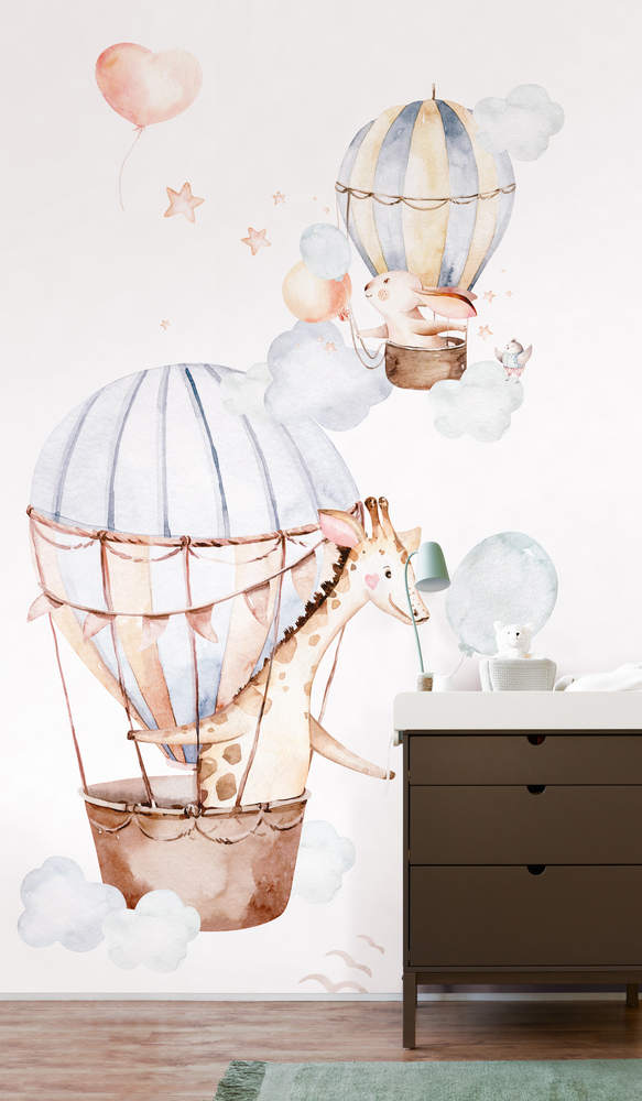 Darauf fliegen wir Ein schönes Wandmotiv kann gar nicht groß genug sein. Deshalb geht es hier mit 1590 x 2650 mm hoch hinaus. So haben die freundliche Giraffe und der kleine Hase genug Platz, um mit ihren Ballons bis zur Decke zu steigen. Aquarelltöne wie Rosa und Blau und liebevoll gestaltete Accessoires sorgen für tolle Abwechslung an der Wand. Aber ohne laut zu werden. Wer in die Verlängerung gehen möchte, kann das Motiv einfach mit den unifarbenen Tapeten oder anderen Motiven aus der Kollekt