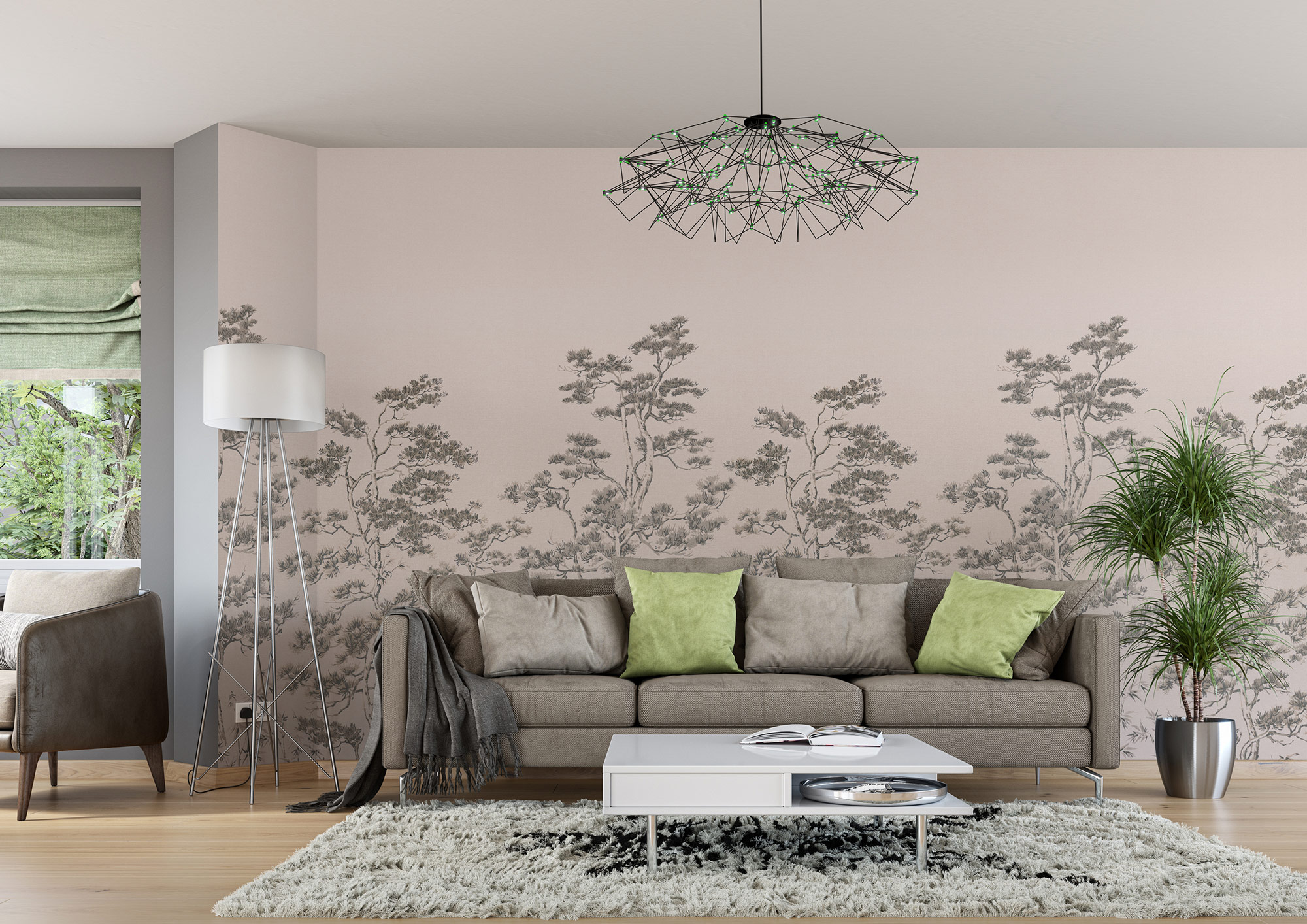 Die dichten Bäume und Gräser ranken sich in zartem Braun auf dem beigen Digitaldruck. Dieser wunderschönen Wald erzeugt sofort ein Gefühl von wohnlicher Behaglichkeit und wirkt wie ein handgemaltes Gemälde an der Wand.