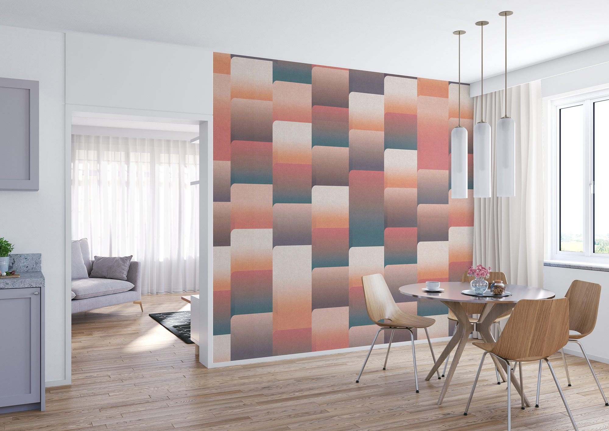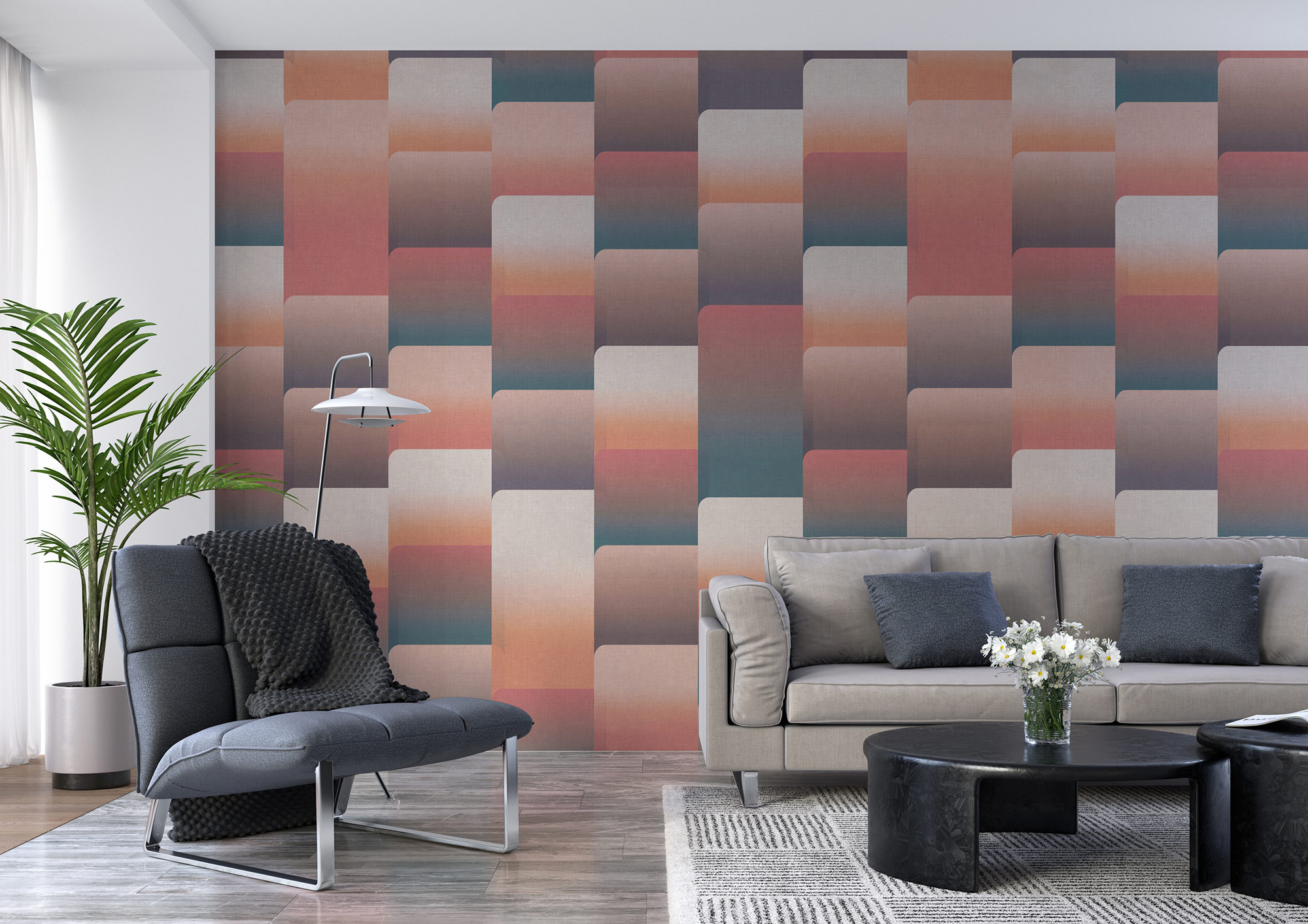Mit runden Ecken und Kanten überrascht dieses Design den Tapetenliebhaber - und liefert so einen formvollendeten Grund, einen neuen Lieblingsort zuhause zu schaffen. Die Dreierkombination aus Blau, Kupfer und Gold wirkt harmonisch, verleiht aber der Wand eine interessante Retro-Note. Am besten Kissen und Accessoires darauf abstimmen, dann wird es perfekt!