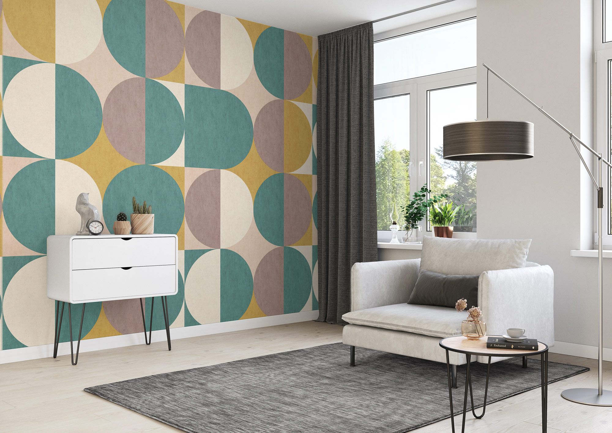 Retro-Charme entdecken: Ausdrucksstarke Muster und ein harmonischer Farbenmix - so lieben wir den Retro-Style. Kein Wunder, dass wir auch einzelne Wände jetzt schön retro in Szene setzen. Bei diesem breiten Wandmotiv formieren sich Kreise in Senfgelb, Brombeer und Aquablau zu einem faszinierenden Gesamtbild, dessen Mustergültigkeit immer wieder mit kleinen Unterbrechungen überrascht.