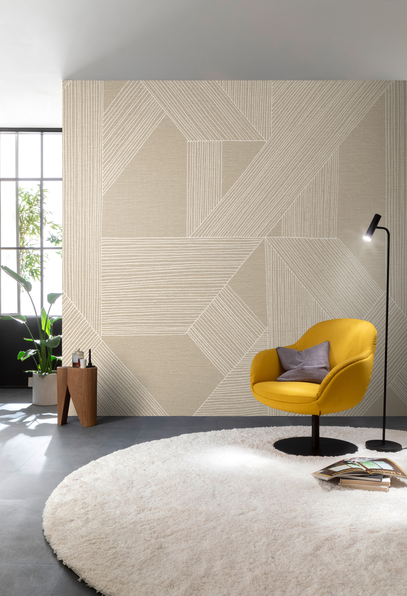 Geometrische Formen sind immer willkommene Mitbewohner. Sie können sich klar ausdrücken, sind lebendig und aufmerksamkeitsstark, nicht zu laut und auch nach Jahren gern gesehen. Bei der 3,00 m x 2,65 m großen Digitaltapete XXL Lines hat sich auf dem hell-sandigen Textilhintergrund ein Rautenmuster neu formiert. Hingucker sind die feinen Linien in Cremeweiß, die frei Hand eingezeichnet sind. Das hat Charme und darf sich gerne an exponierter Stelle im Raum zeigen.