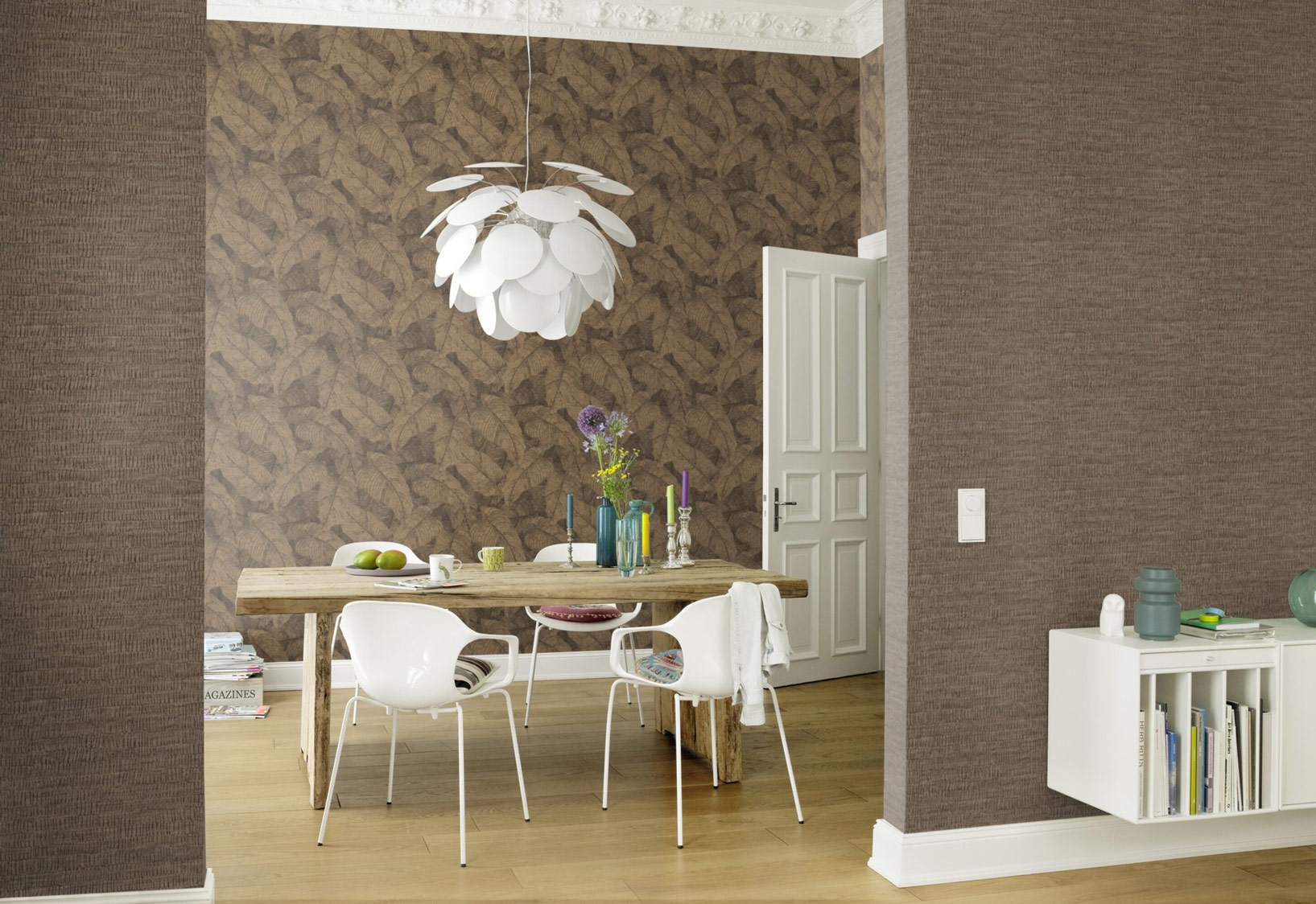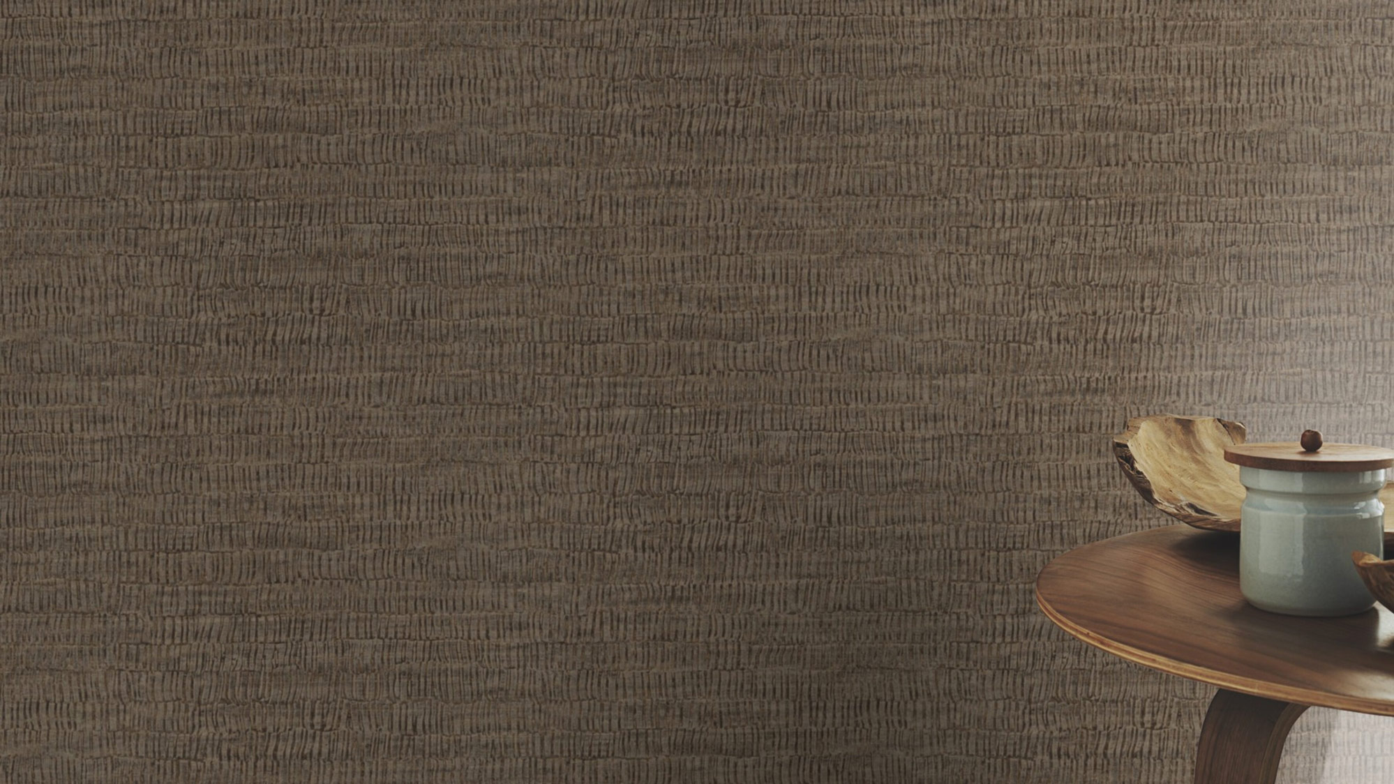 Das hat Struktur: Schlicht ist schön, aber manchmal darf es auch ein bisschen mehr sein. Eine Strukturtapete ist eine gute Wahl, um dem Raum einen modernen, kreativeren Touch zu verleihen ? ohne, groß aufzufahren. Dieses Muster erinnert an die Rinde eines Baumes und wirkt durch seine individuelle Optik und Haptik herrlich natürlich. Schick wird es durch die Kombination von hellem Messing und dunklem Kupfer ? zwei, die sich ideal für den skandinavischen Wohnstil oder Einrichtungen im Factory-Look