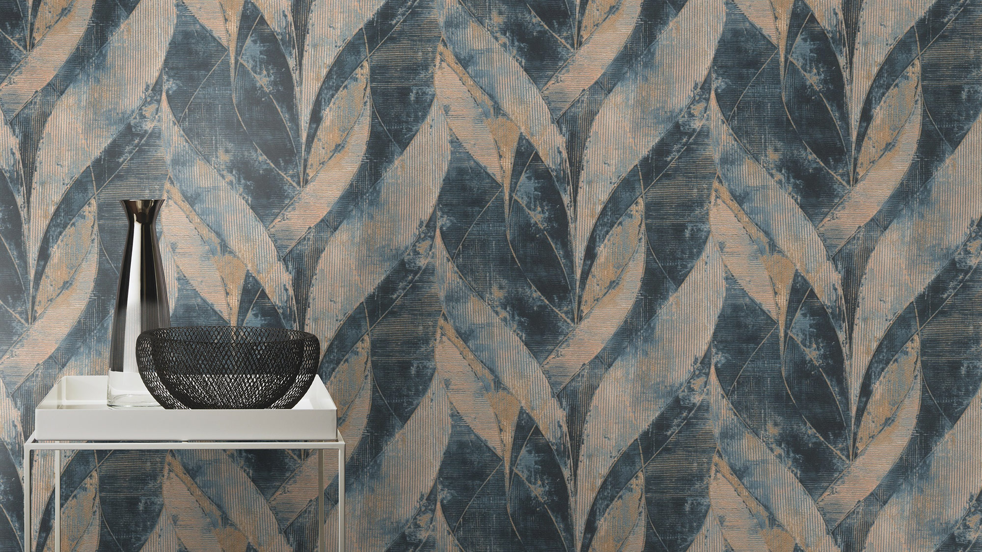 Wie von selbst fesselt diese in sich verschlungene Grafik mit dreidimensionalem Effekt den Blick des Betrachters an sich. Durch die extravagante Struktur und den feinen Glitzerauftrag in mattem Gold lässt diese Vliestapete in Dunkelblau, Himmelblau und Beige jedes Zuhause im Handumdrehen elegant und lebendig erscheinen.
