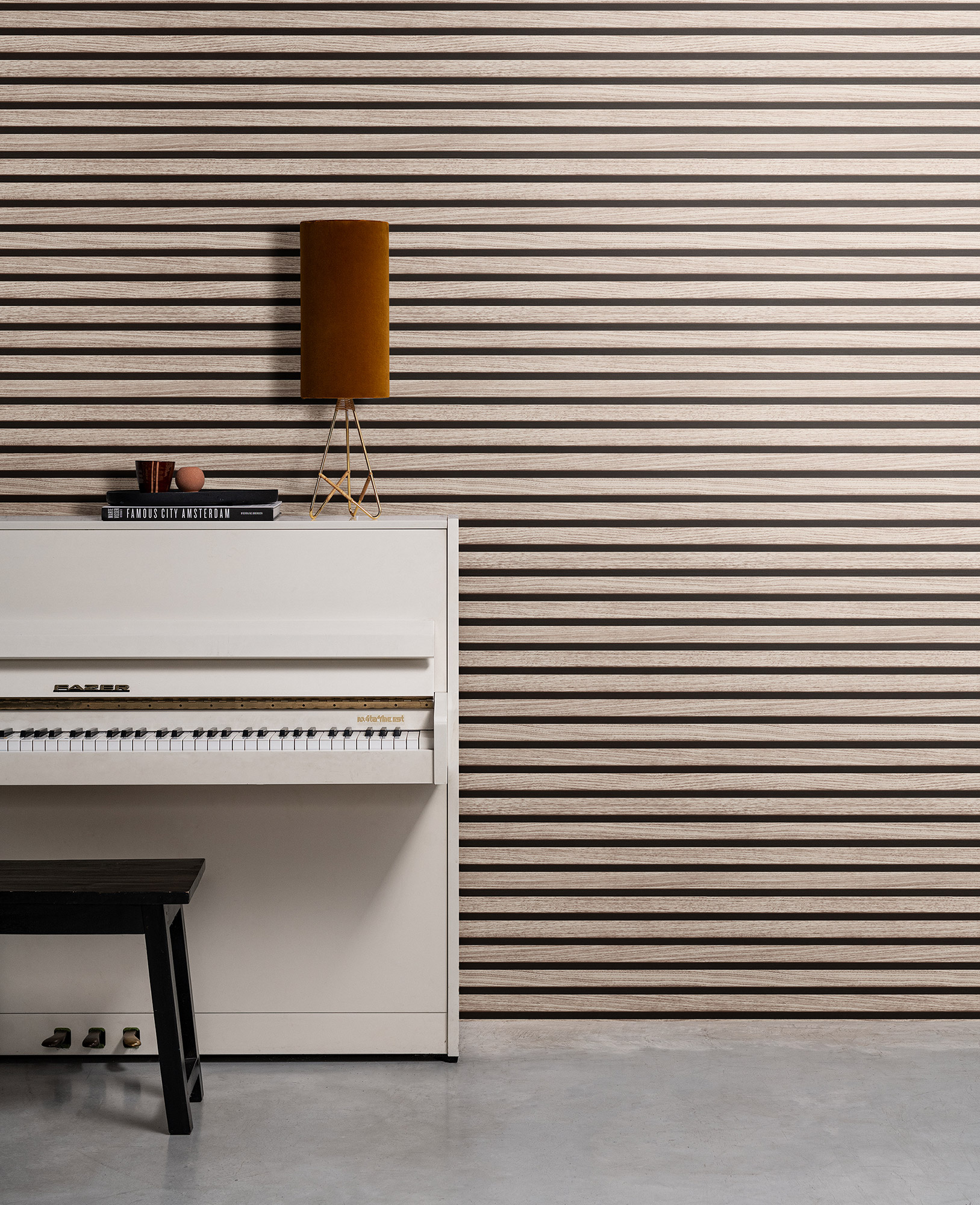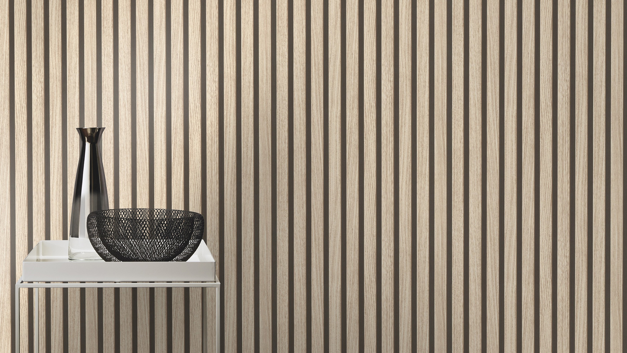Akustikpaneele sind für eine perfekte Klangwirkung und designstarke Optik eine erstklassige Lösung. Wer jedoch kein Problem mit der Akustik in seinem Zuhause hat, aber nicht auf diesen besonderen Hingucker verzichten möchte, kann es sich nun ganz einfach machen. Denn mit dieser beigebraunen Vliestapete sind die schmalen Holzleisten im Nu an der Wand.
