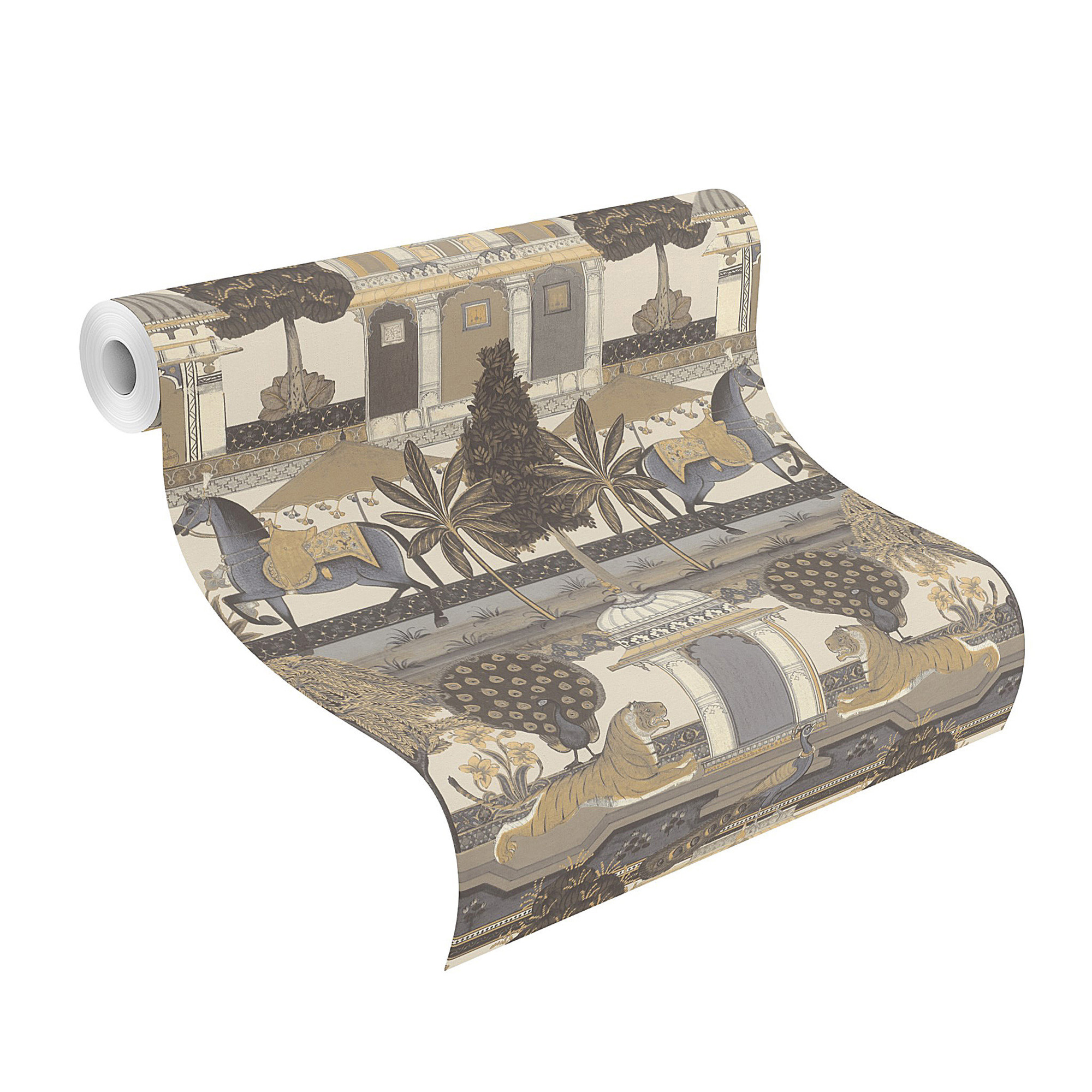 Majestätisch präsentieren sich die Tiger flankiert von den vornehmen Pfauen im imposanten Garten des Maharadschas. Auch die Pferde schreiten stolz vor dem Palast auf und ab. Was für ein beeindruckender Anblick. Bei dieser Vliestapete finden sich neben Weiß und Schwarz auch die unterschiedlichsten Nuancen von Beige und Grau.