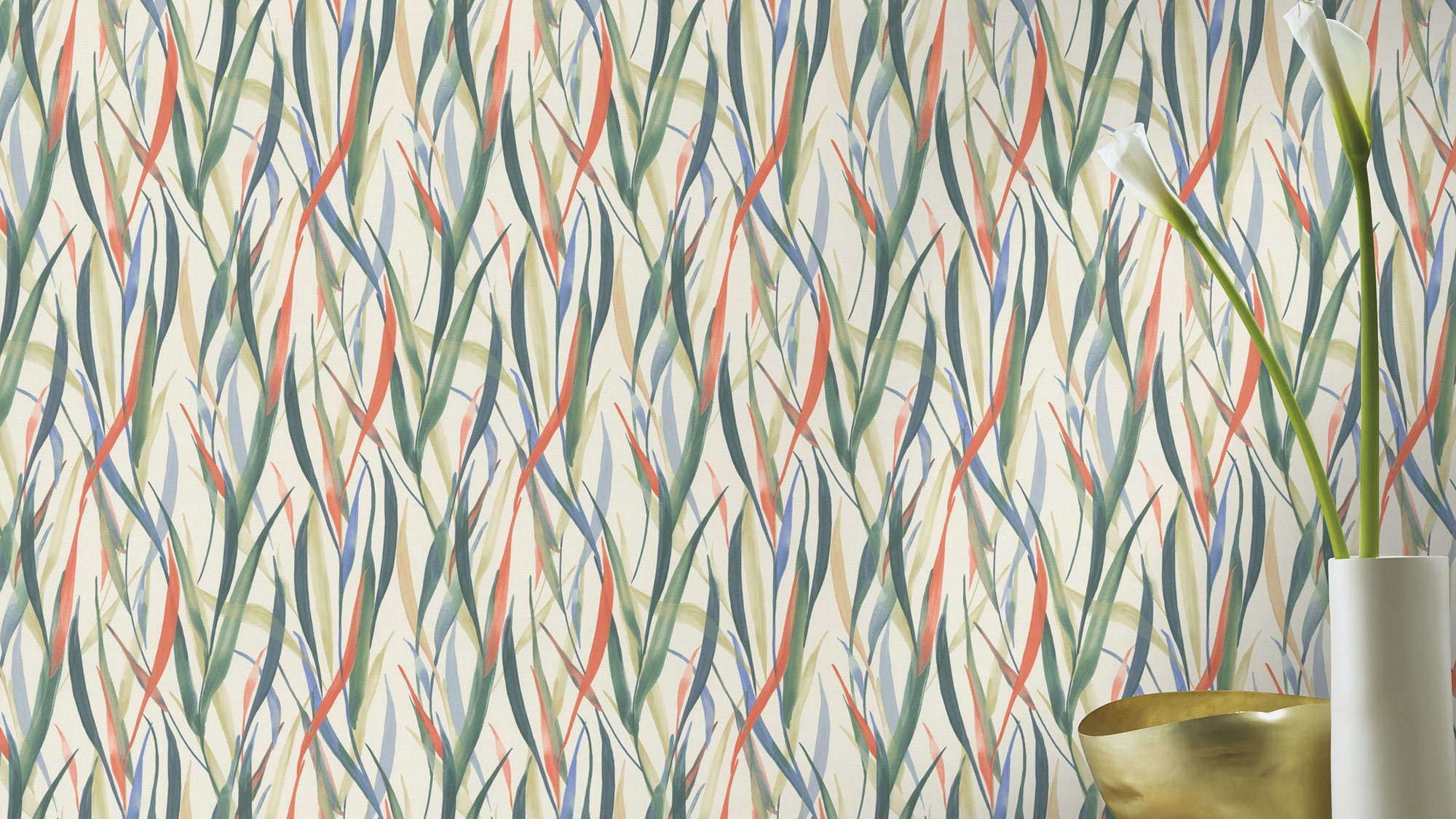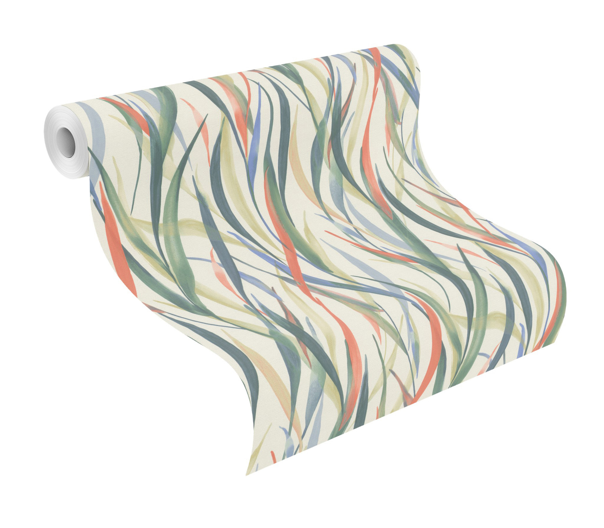 Lassen Sie die Natur in Ihr Zuhause einziehen! Diese faszinierende Vliestapete mit leichter Textilstruktur präsentiert sich mit einer beeindruckenden Darstellung von überdimensionalen Gräsern. Das Muster erzeugt eine imposante Illusion von lebendigen Grashalmen in verschiedenen Grün-, Blau- und Rottönen auf weißem Hintergrund, die sich sanft im Wind wiegen. So können Sie bei Ihren Tagträumen die frische Brise spüren, die durch Ihre Räume weht.