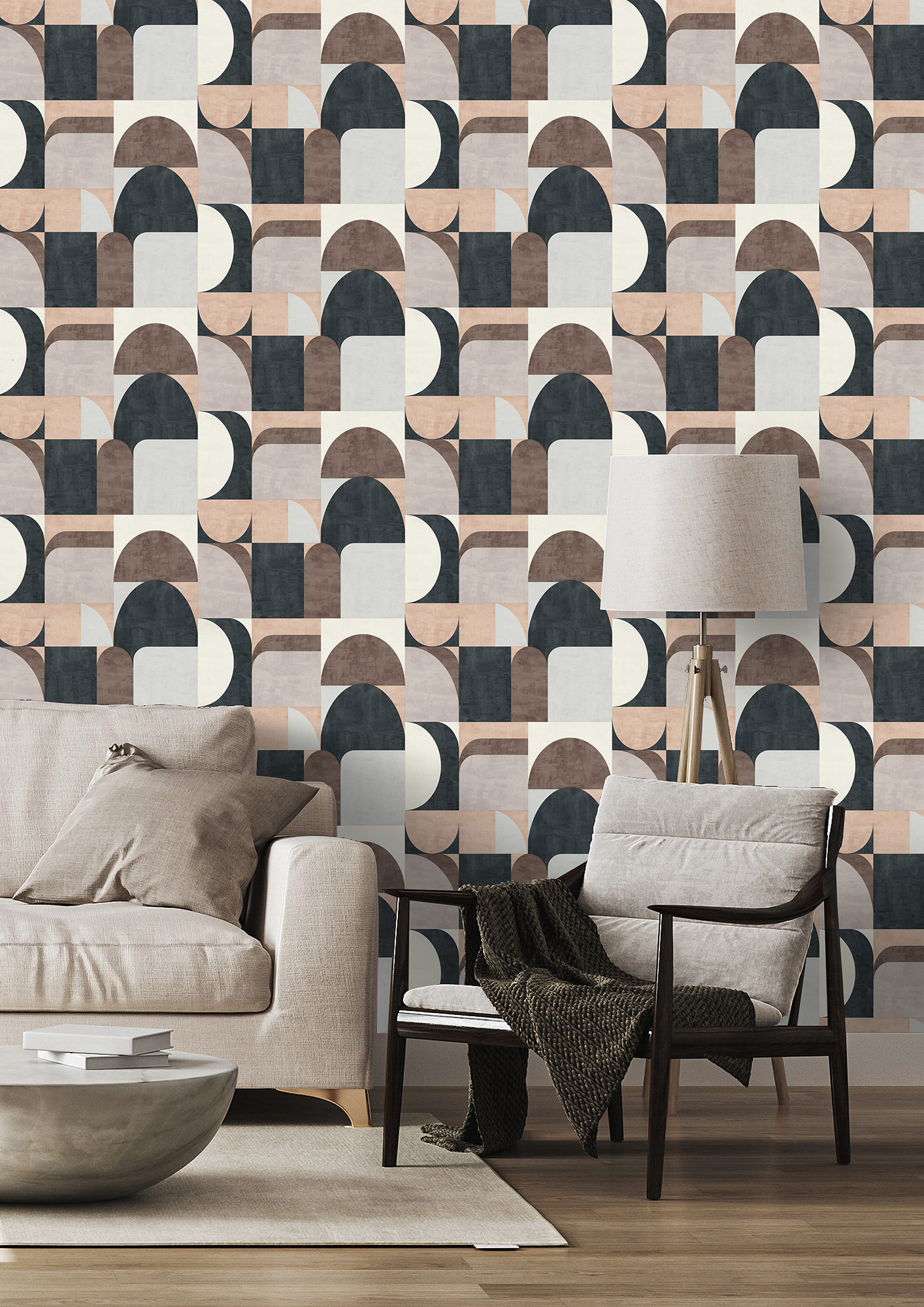 Wow, einen ganz besonderen und individuellen Charme strahlt diese Mustertapete aus. Das graphische Design in Weiß, Rosé, Hellgrau, Altrosa, Braun und Schwarz inszeniert sich mit einem Retro-Touch und strahlt trotzdem Modernität aus. Ecken und Rundungen wechseln sich geschickt ab und überraschen so immer wieder aufs Neue. Und schon verwandelt sich die Wand im Wohnzimmer zu einem raffinierten Kunstwerk.