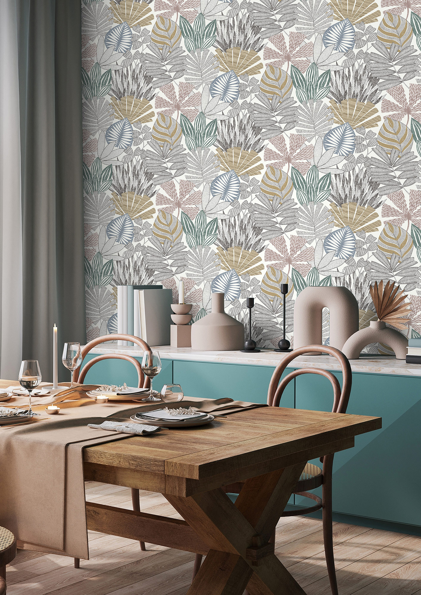 Beim Anblick dieser bezaubernden Komposition an fantasievollen Blättern könnte man annehmen, dass Alice im Wunderland ihre Sammlung hier zur Schau stellt. Auf dem weißen Hintergrund mit leichter Struktur inszenieren sich die unterschiedlichsten Blätter in Rosa, Blau, Grün, Braun und Schwarz und werden so zum absoluten Hingucker.