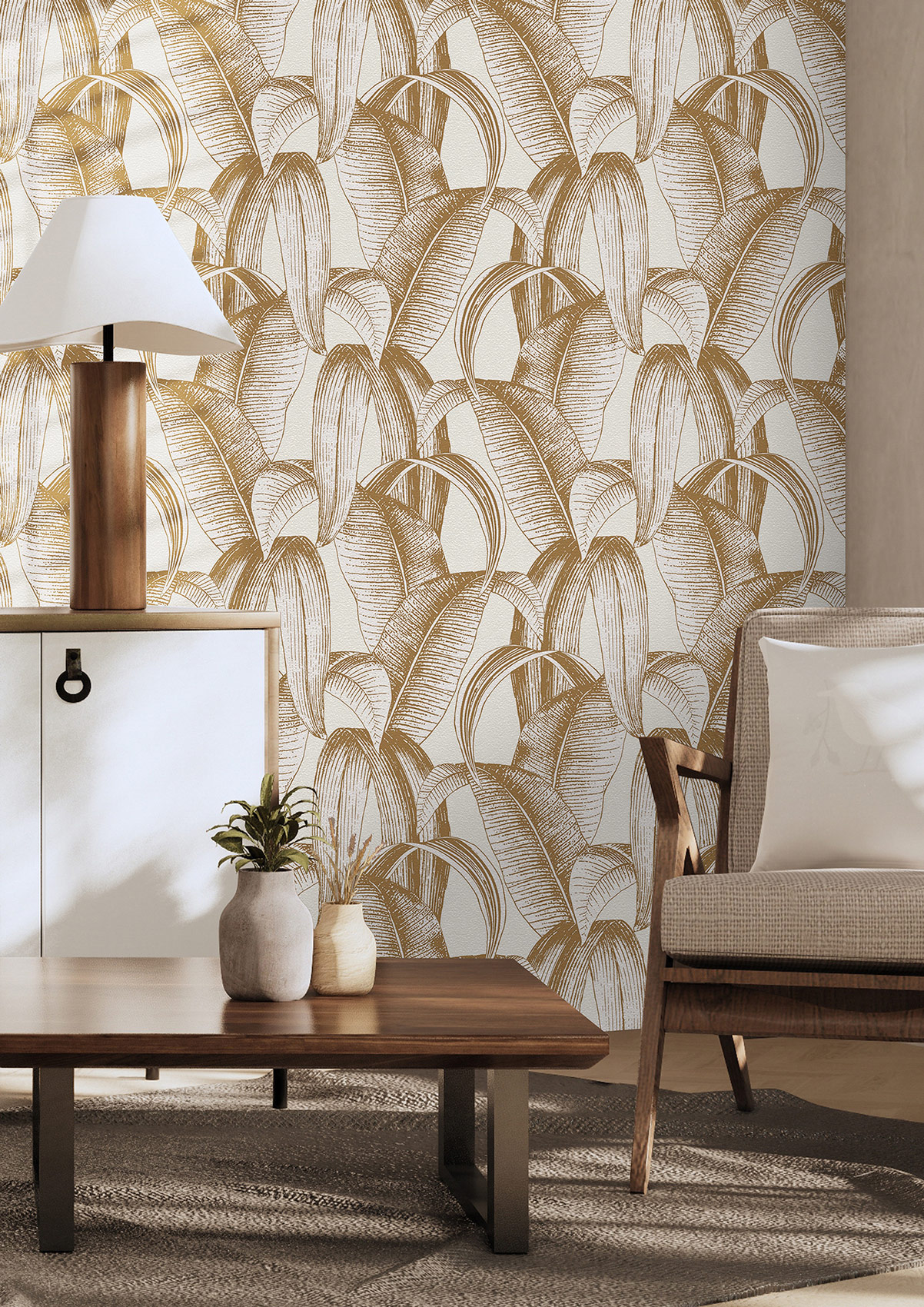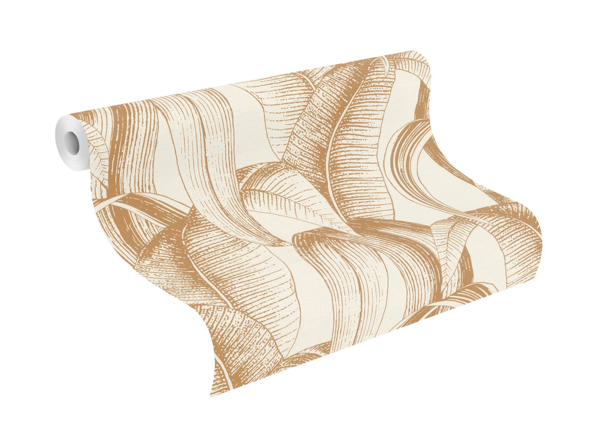 Diese Bananenblätter dürfen gerne Größe zeigen. Die Blätter haben sich in einem warmen Honiggelb dekorativ an die Wand gepflanzt und verströmen eine lebendige und natürlich Atmosphäre auf dem cremeweißen Hintergrund mit feiner Textilstruktur. Und viel mehr braucht man dann gar nicht mehr, um es sich zuhause schön wohnlich zu machen.