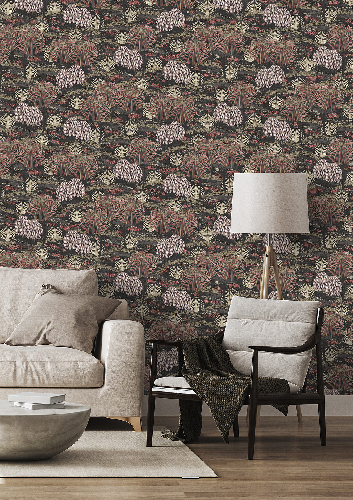 Hokuspokus! Und schon steht man mitten in einem traumschönen Zaubergarten. Die verspielten Bäume mit ihren faszinierenden Baumkronen, die an ein Feuerwerk erinnern, und die bezaubernden Büsche und Blumen auf dem schwarzen Hintergrund mit feiner Struktur lassen einen großartigen Wandschmuck entstehen. Perfekt wird es durch die gelungene Farbkombination von Weiß, Flieder, Beige, Rostrot, Grünbraun und Dunkelgrau.