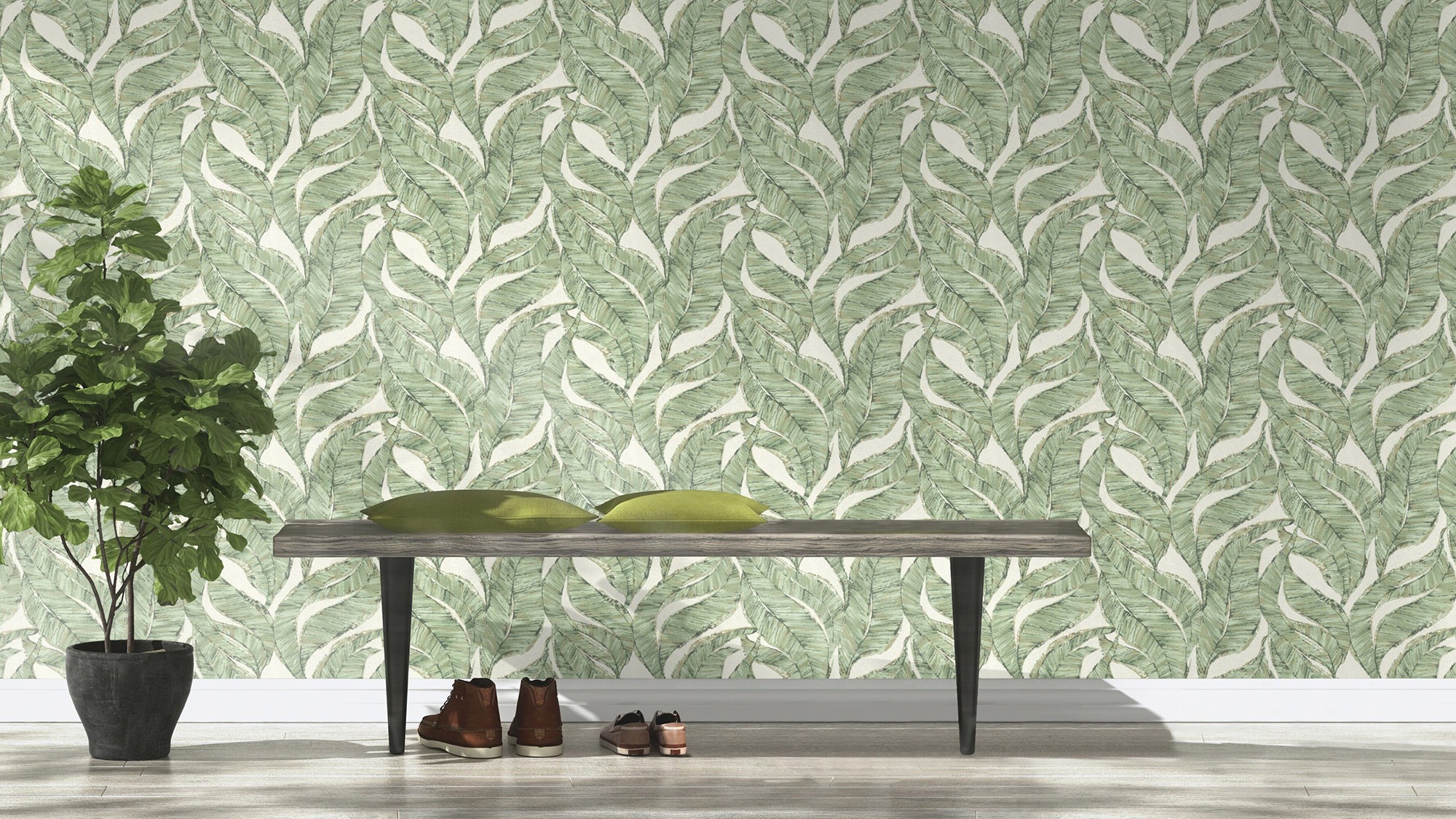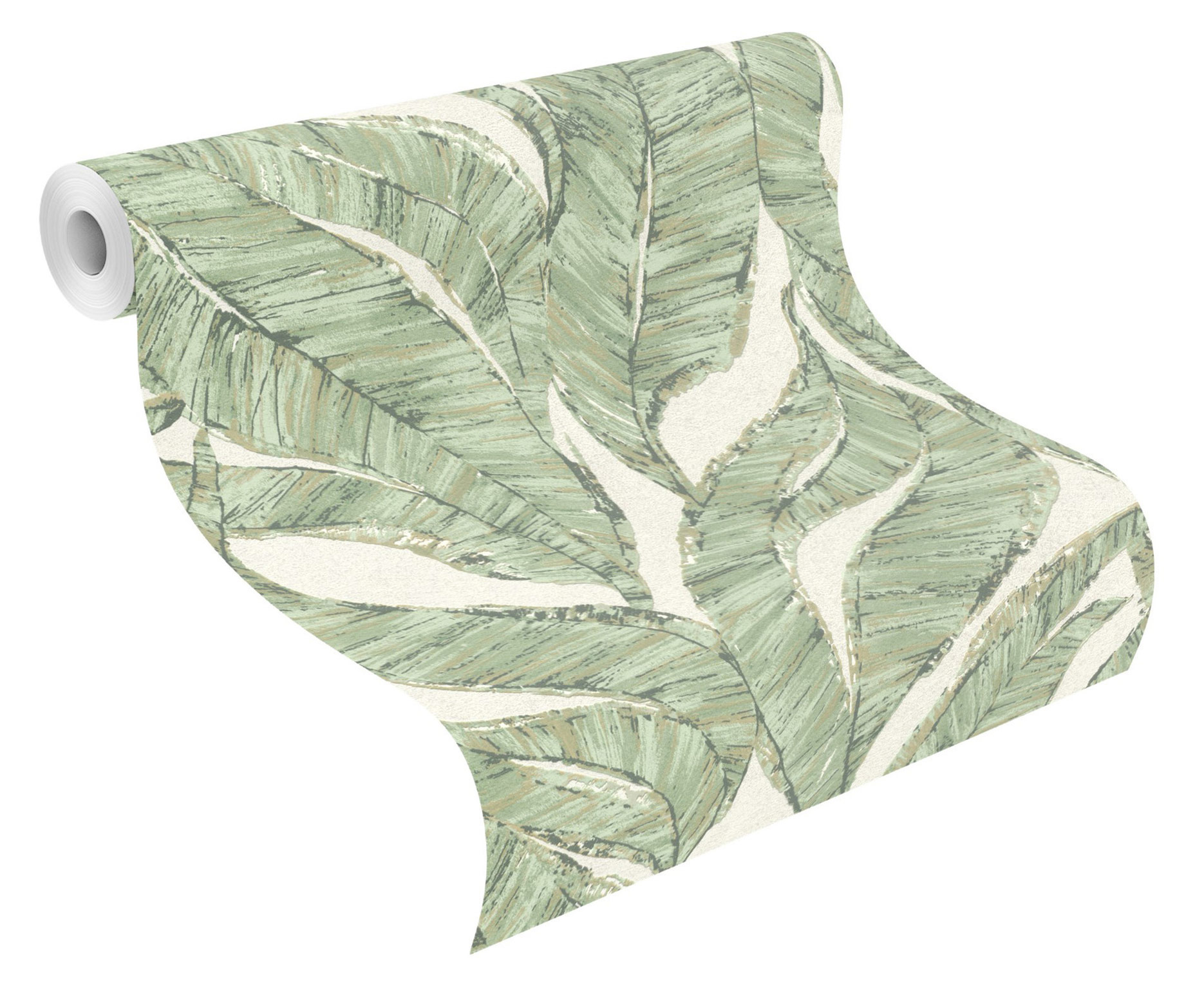 Dieses Blattmotiv darf gerne Größe zeigen. Harmonisch wirkt das Zusammenspiel aus verschiedenen Grün- und Beigetönen auf dem cremefarbenen Hintergrund mit feinem Glanz. Dank unterschiedlicher Strukturen erhält das Design eine imposante Dynamik, so dass ein spannender 3-D-Effekt entsteht. Ideal für Eyecatcher-Wände und ein toller Kontrast zu geradlinigen, leichten Wohnaccessoires.